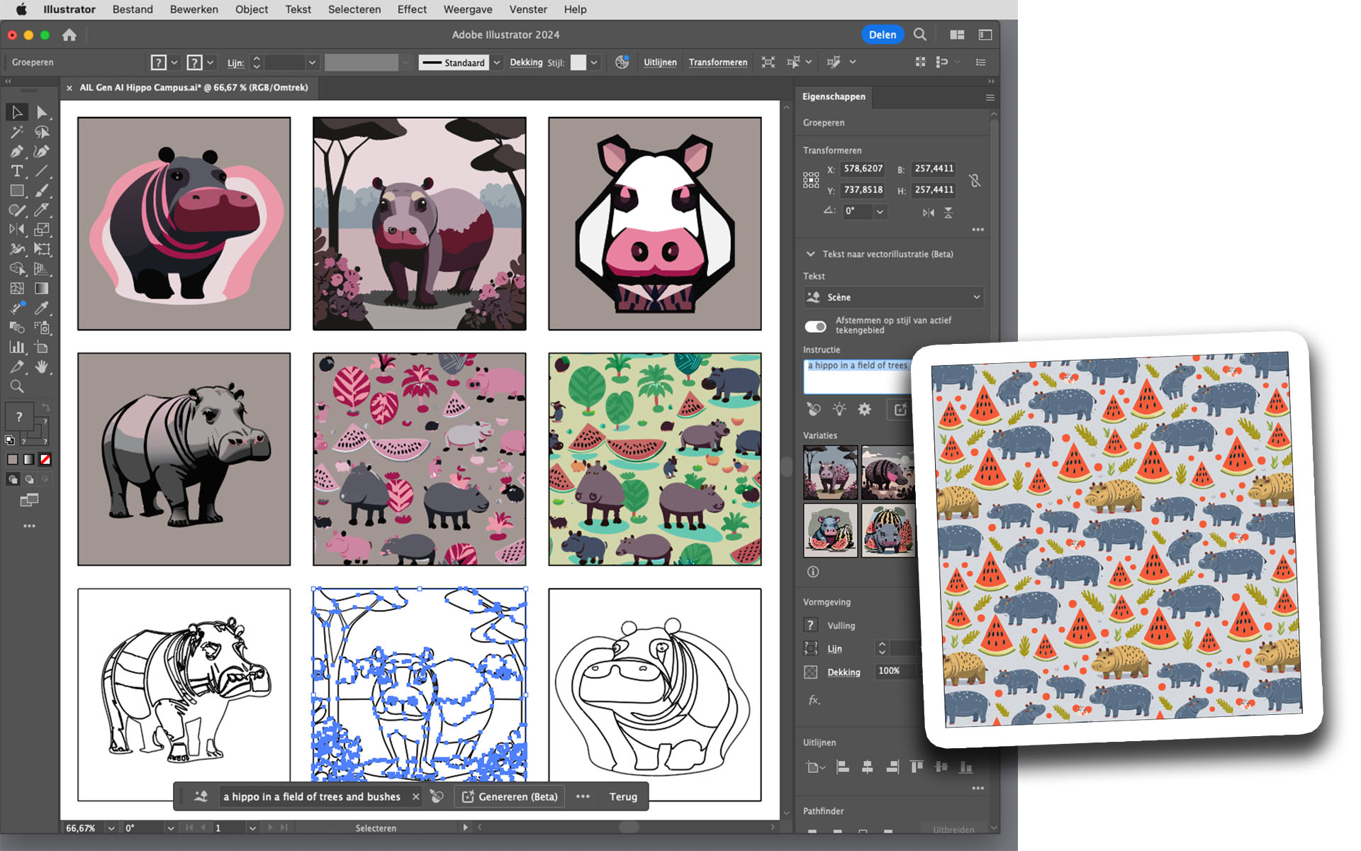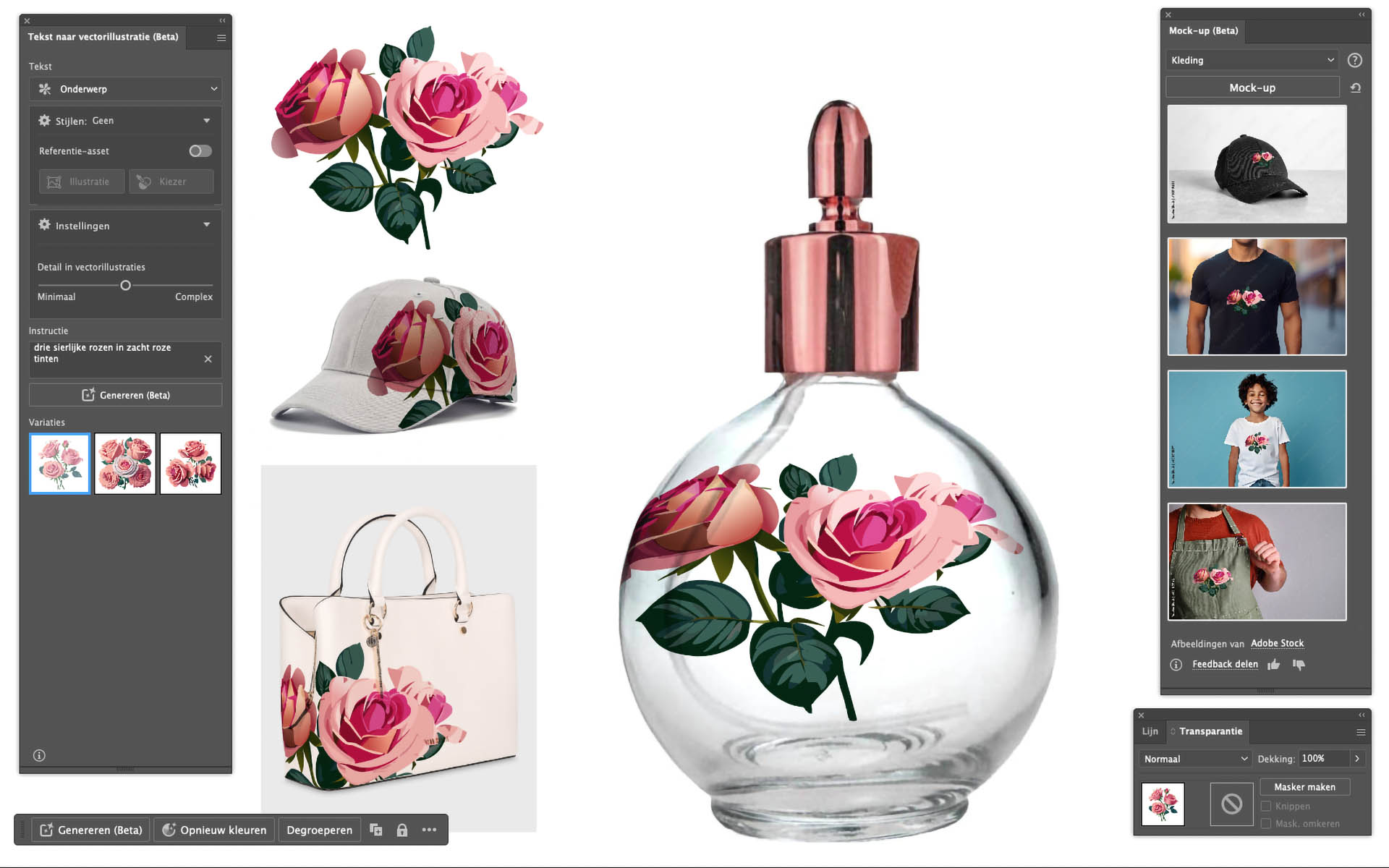 En niet alleen in Photoshop – ook in Adobe Illustrator gebruik je generatieve AI om ikonen, voorwerpen, patronen of hele omgevingen te creëren en te variëren. Vectorisch tekenwerk, aanpasbaar, schaalbaar en dus altijd scherp. Andere kleurstelling? Roep maar, zo gebeurd. Een eigen logo op een foto van een pet of fles shampoo draperen? Kleine moeite.