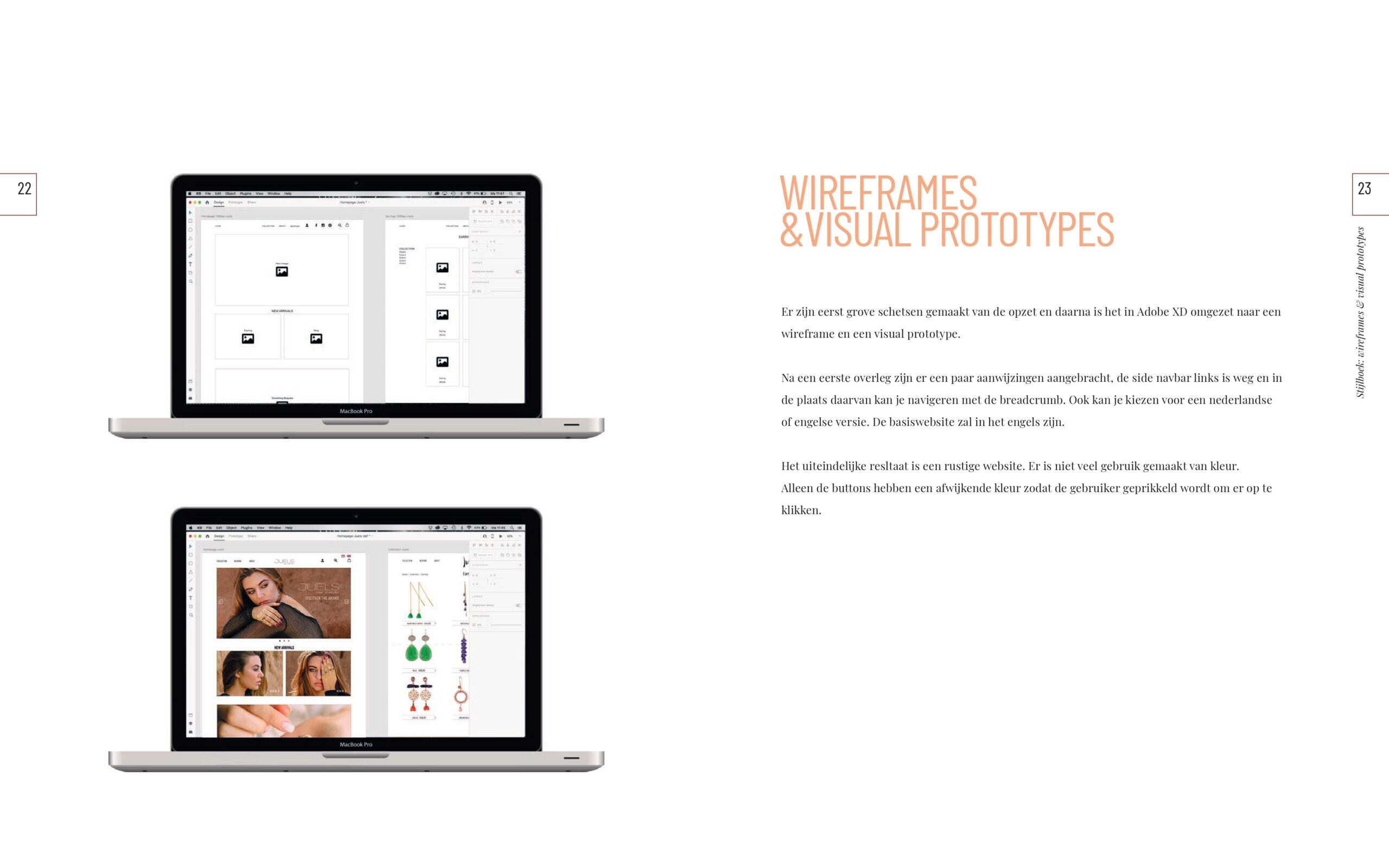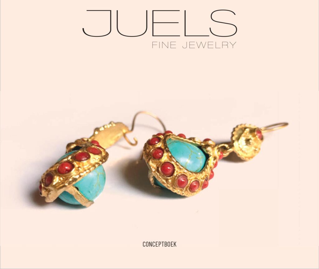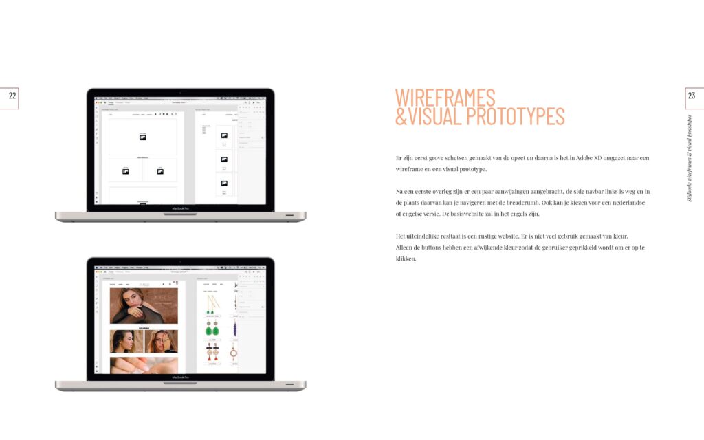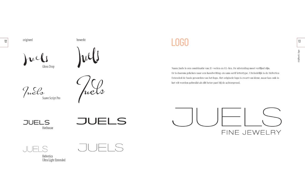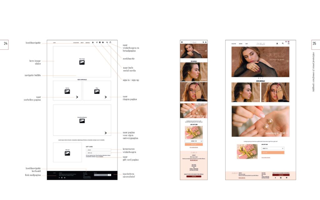 Hier zien we een conceptboek waarin de huisstijl en het websiteontwerp van sieradenmerk Juels zijn uitgewerkt. Het project begon met een brainstormsessie over het bedrijfsconcept en de website. Vervolgens werd een flowchart voor de navigatie van de site gecreëerd en een bijpassend logo ontworpen. Daarna werd de algemene uitstraling van de website bepaald, inclusief kleuren, typografie, iconen en beelden. Ten slotte werden storyboards en prototypes van de verschillende pagina’s gemaakt.
